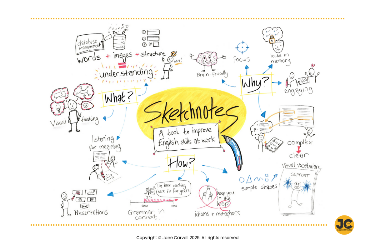 When you think about improving English language skills for work, you might imagine a speaking workshop, grammar books, or maybe a language app. But there’s another method that’s both fun and effective: sketchnoting.